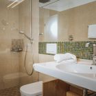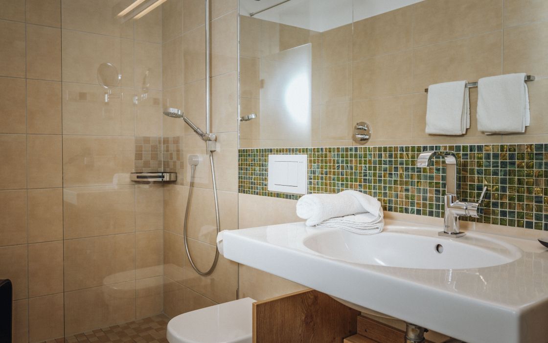 Bad mit Dusche, WC, Haartrockner, Handtüchern, Hausschuhe und Pflegeprodukten.