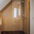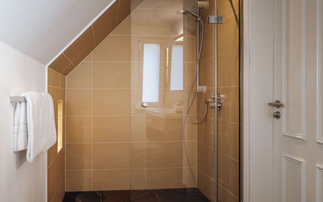 Bad mit Dusche, WC, Haartrockner, Handtüchern, Hausschuhe und Pflegeprodukten.